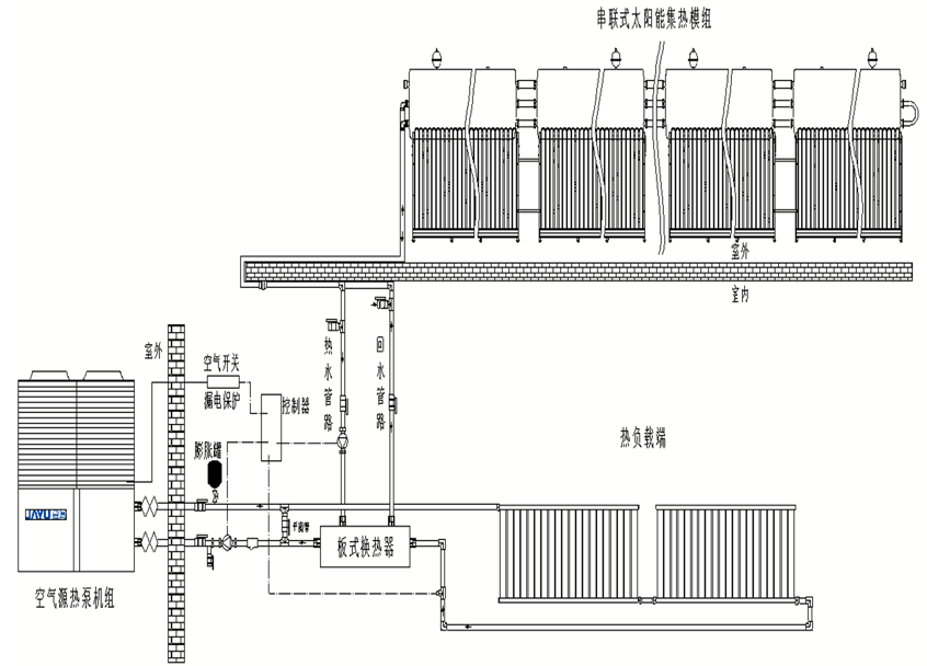3.空氣源熱泵安裝在室外,用于無太陽能情況下的補充采暖;