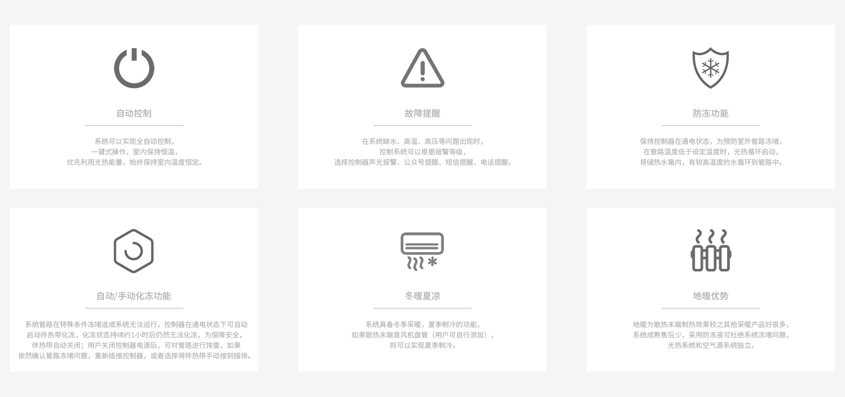 1.本戶用采暖系統系統由部分構成:光熱采暖機、空氣源熱泵系統、循環水泵、云控器及水路管線等。