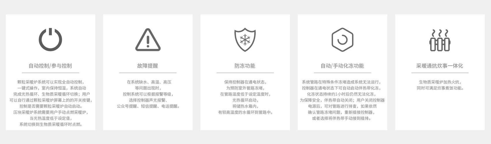 當天氣不好或其他原因,太陽輻射能量不充足,水箱內水溫不能滿足啟動采暖功能使用要求時,云控器控制電動二通閥開啟,啟動室內采暖循環(huán)模式,自動或手動點燃生物質采暖爐,將通過生物質采暖爐內部的水加熱,從而將熱量傳遞到房間內,提升房間內的環(huán)境溫度。生物質顆粒爐可自動控制燃燒功率;壓塊爐需要手動調節(jié)。