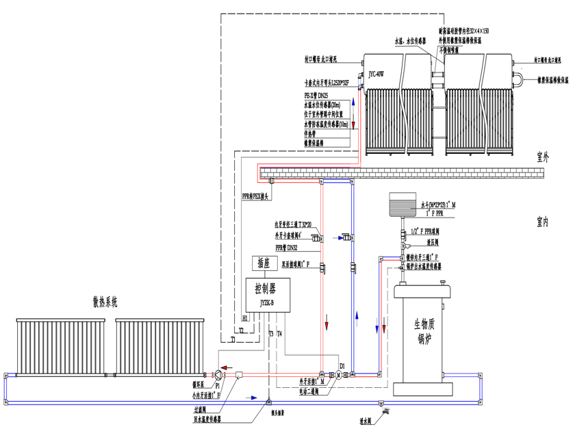 1.本戶用采暖系統(tǒng)系統(tǒng)由部分構成:光熱采暖機、生物質采暖爐、循環(huán)水泵、云控器及水路管線等。